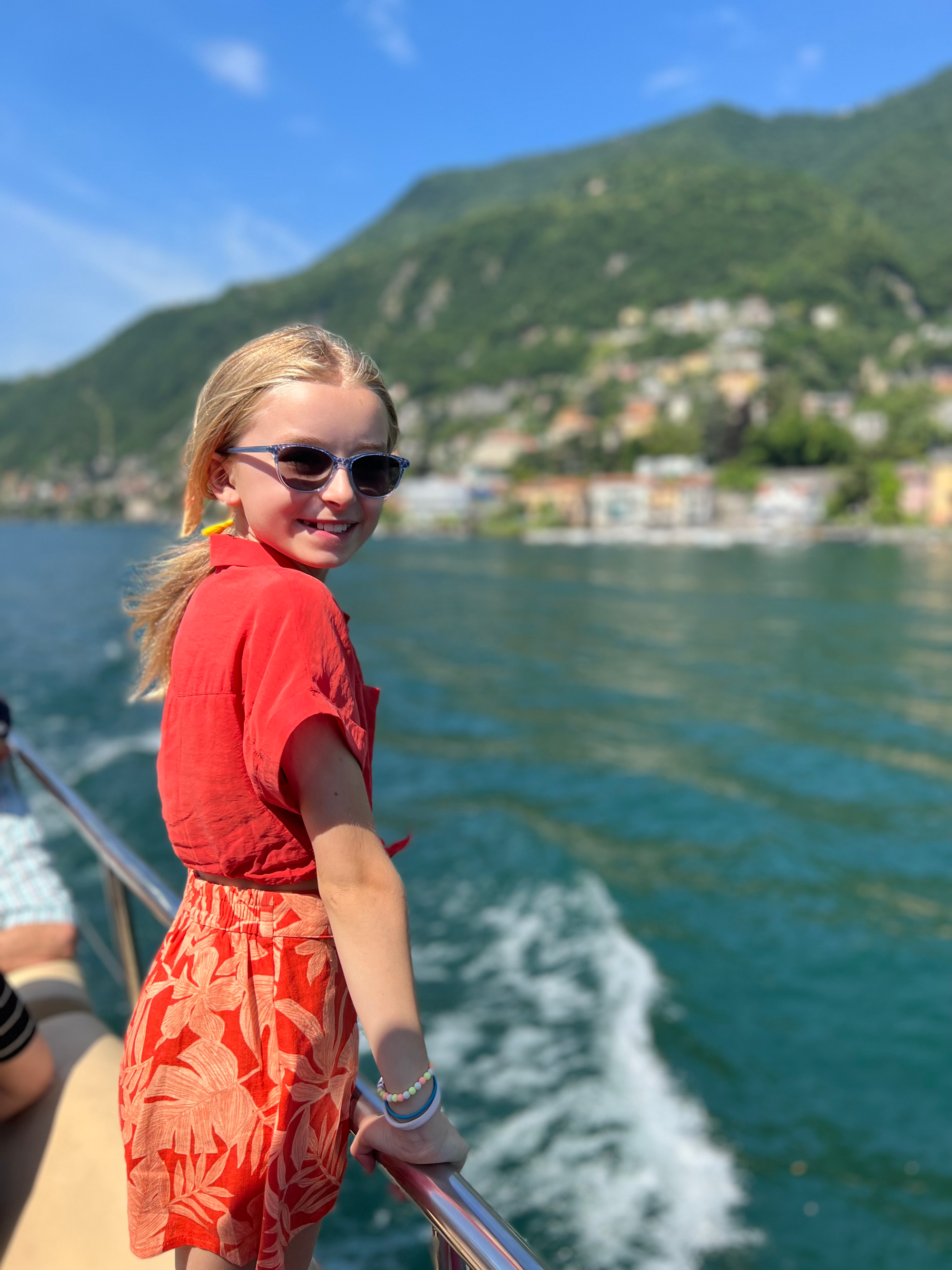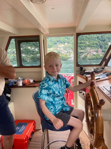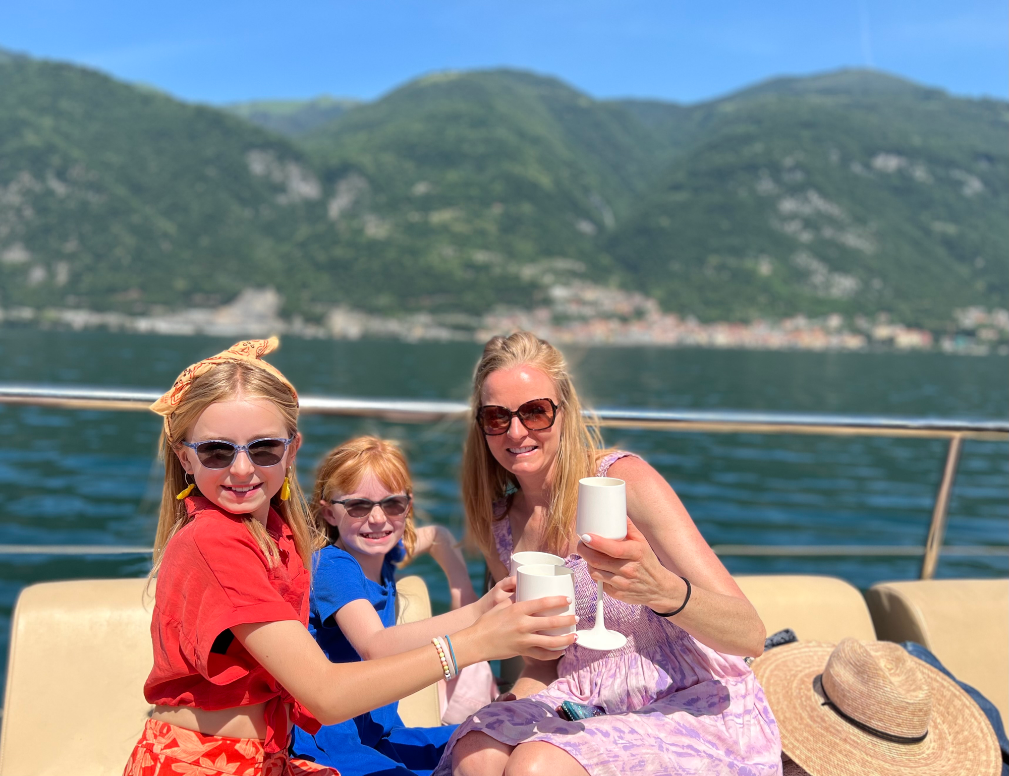 One of the pre-wedding activities was a boat cruise where we all boarded a ship and went from Como to Bellagio and back. This was a fantastic time when all the wedding guests, friends, and family got to be together for the first time. The kids loved the boat ride, and everyone made them feel special and included. It turns out that George is quite the Paparazzi and ran around taking pictures of everyone. He also got to “drive” the boat while the girls lounged around pretending they were movie stars.